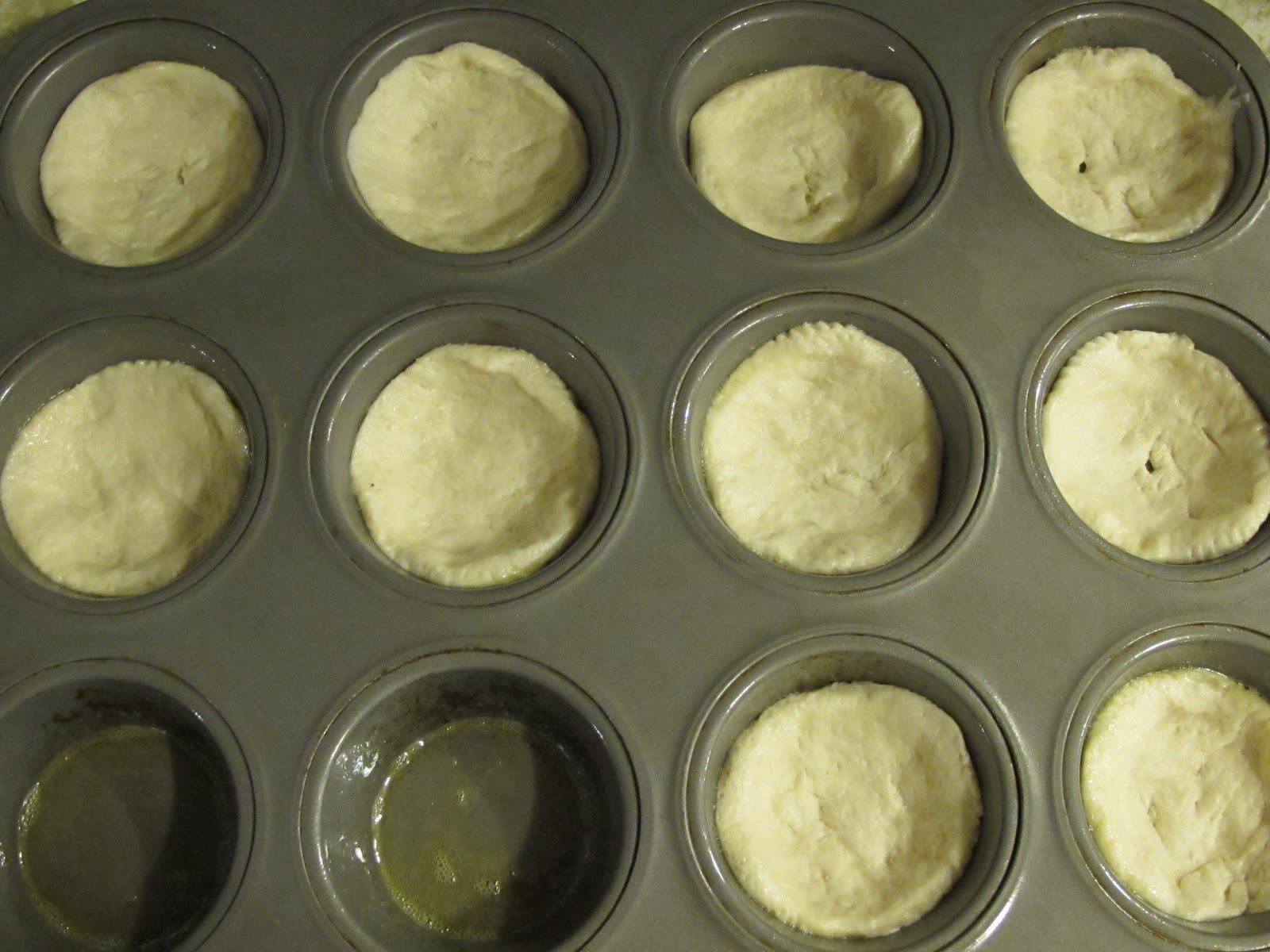 3. Separate biscuits and press each one into a section in the muffin pan, so the biscuit is like a crust.