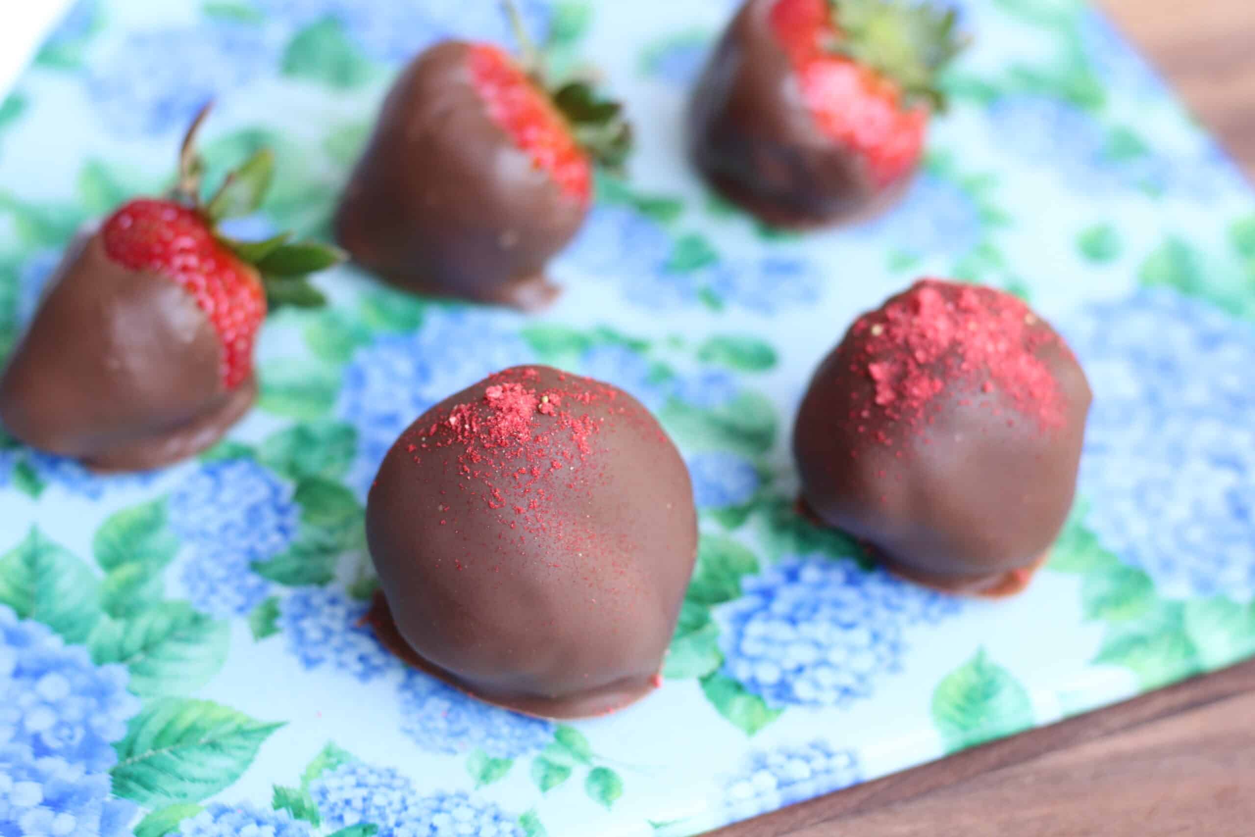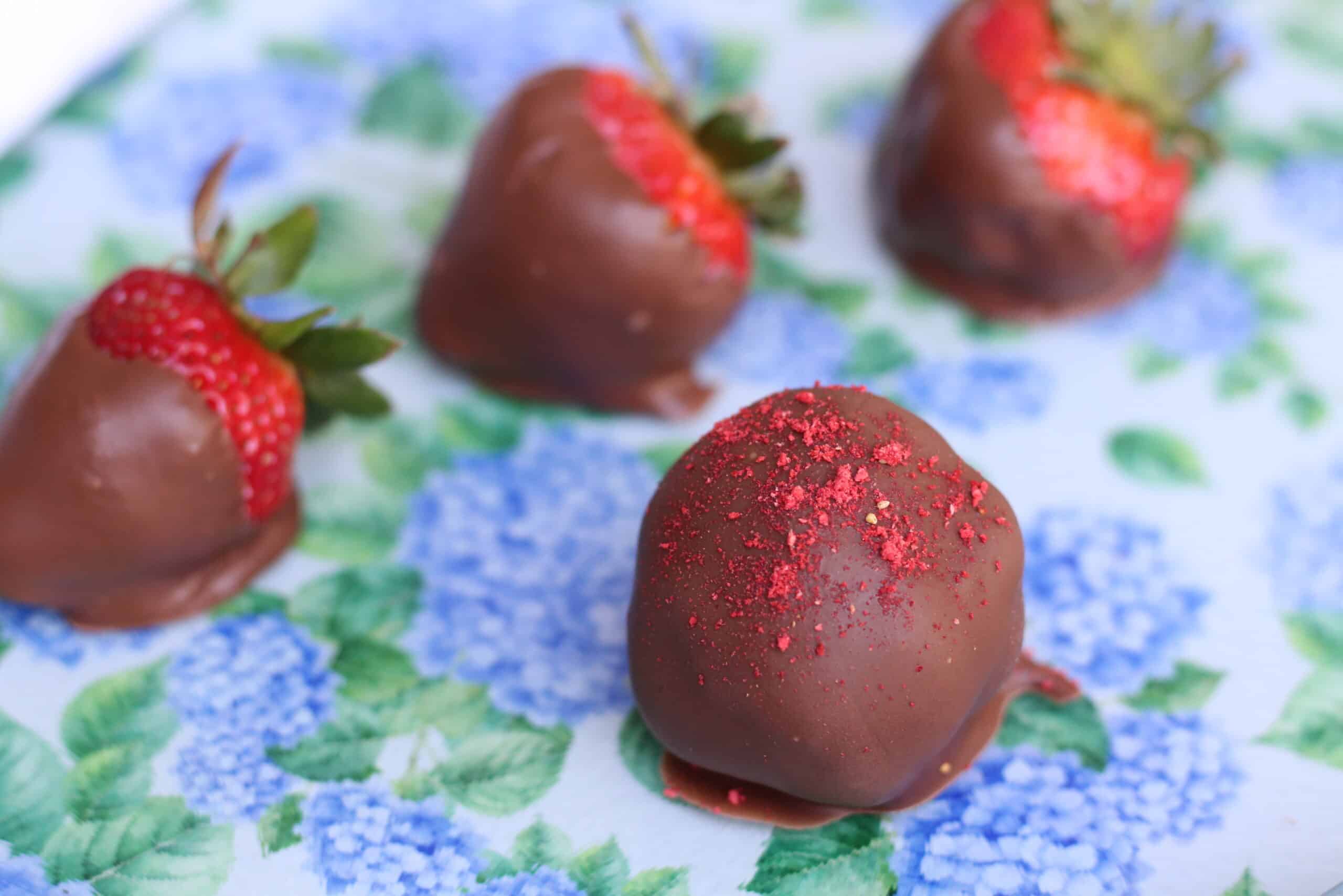- Sprinkle crushed freeze dried strawberries on top, when chocolate is wet.
