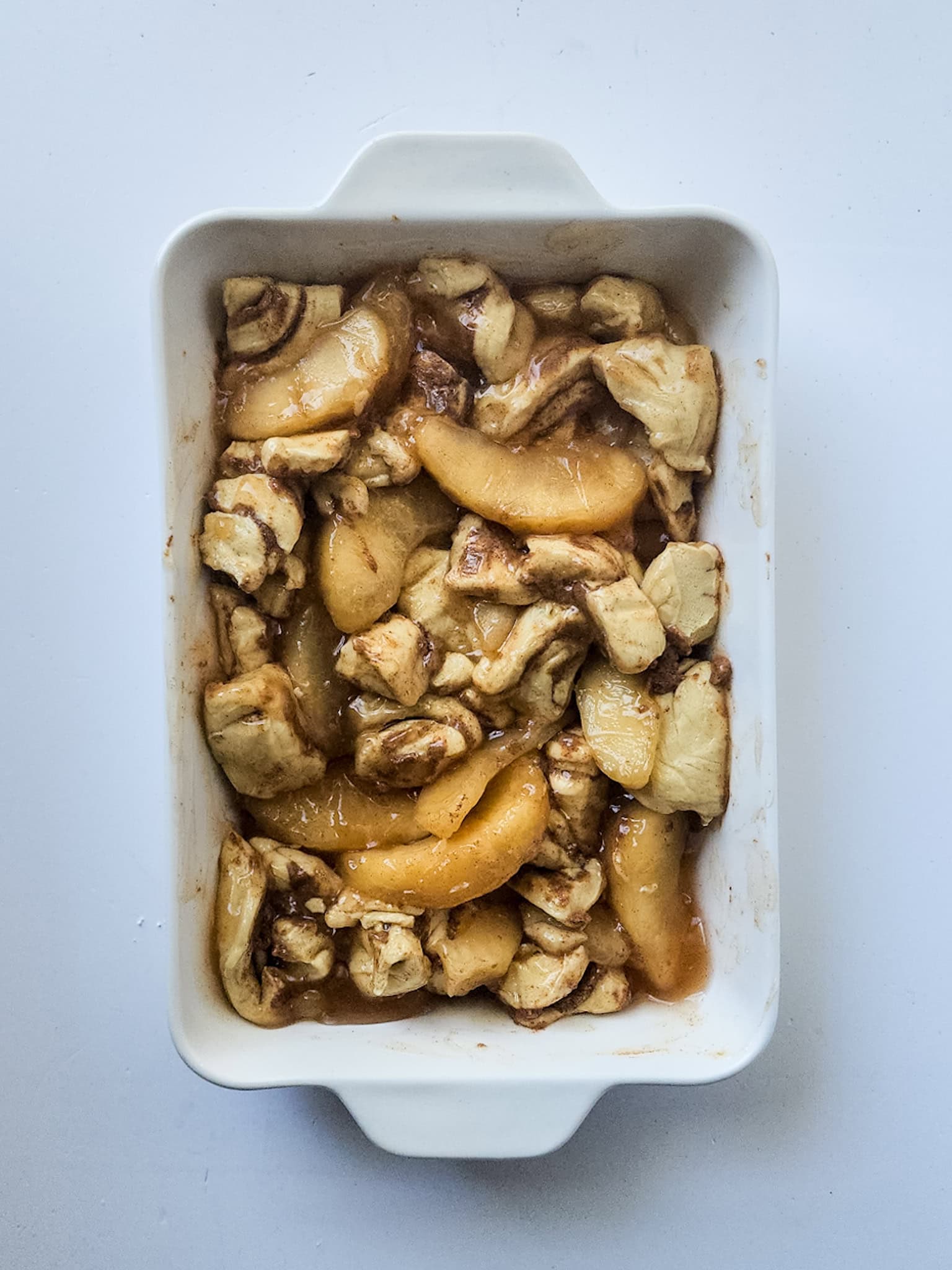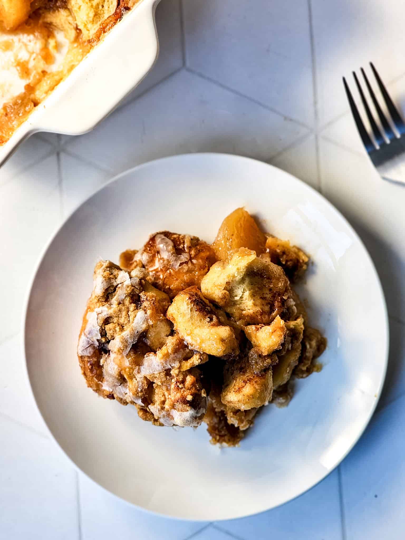 This recipe is similar to cobbler or bread pudding, but it is totally different, too. The edges get golden and crisp, while the center stays soft and gooey. You can serve it with vanilla ice cream to make a super indulgent dessert, or eat it warm for breakfast with a cold glass of milk or hot cup of coffee.