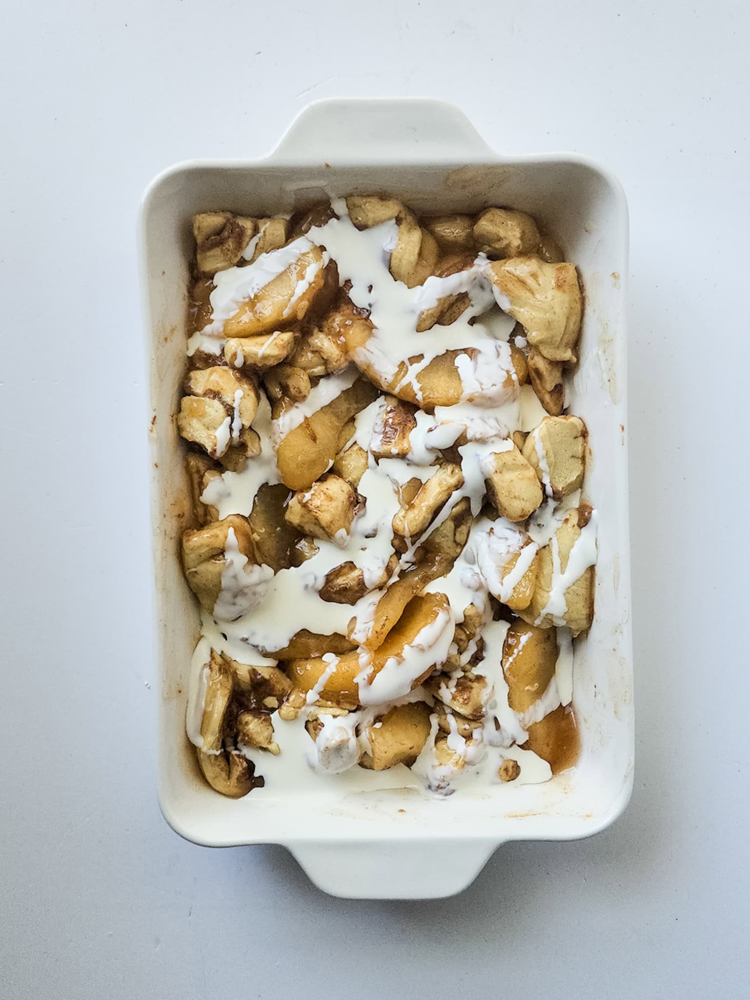 - Remove the cinnamon rolls from the tube and cut into pieces, placing in the baking dish as well. Set aside the icing for later.