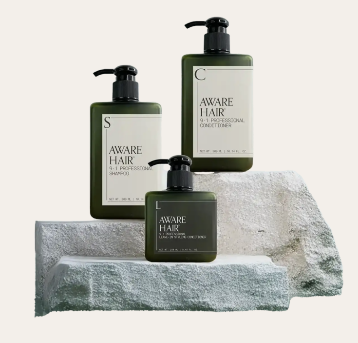 Discover the luxury of AWARE 9·1 with the Professional Collection bundle, which includes our signature cleansing, conditioning, and styling formulations. Each bottle is concentrated with specialty sourced actives including low and high molecular weight hyaluronic acid, Tahitian microalgae, green tea extract and more to nourish, protect, and strengthen your hair and scalp.