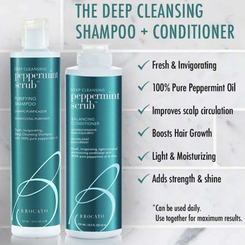 Brocato Peppermint Scrub™ Purifying Shampoo + Balancing Conditioner is a powerful duo that deep cleanses and moisturizes to restore your hair and scalp to optimal health.