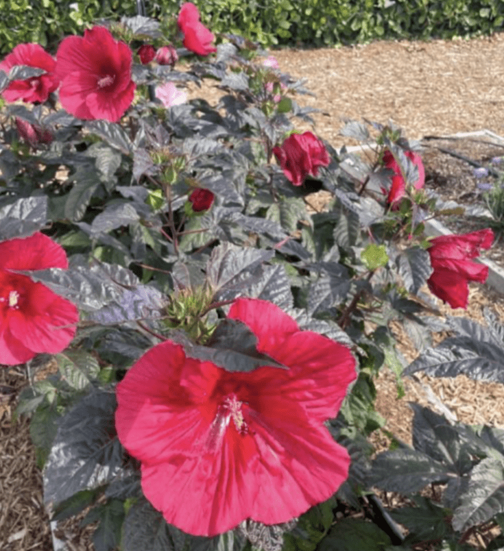 Moonshadow™ Carmine Hardy Hibiscus (Hibiscus moscheutos 'G16124') is a gorgeous new variety of perennial Hibiscus with loads of improvements over standard varieties! Starting with the enormous brilliant red satiny petals that are 100% highly saturated, intense color! These huge blooms with their overlapping petals form wide open trumpets and each features the pale, buttery yellow stamen that you'd expect from the Hibiscus flower family! Then add profuse flowering, reduced viable seeds and insect damage resistance!