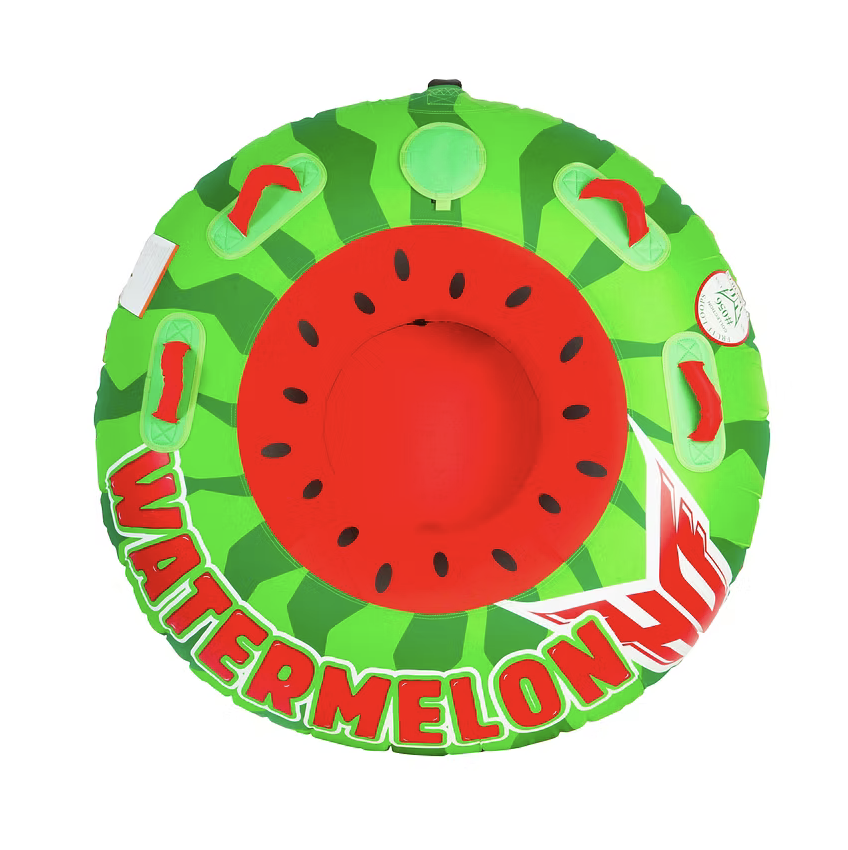 The HO Sports Watermelon Towable Tube is a fantastic addition to your summer water activities. Its vibrant watermelon design not only adds a fun aesthetic but also ensures high visibility on the water. The tube is crafted for single riders, featuring a classic donut shape that allows for versatile riding positions: either sitting with feet forward or lying on your belly. Comfort is prioritized with soft foam handles equipped with built-in knuckle guards, and the full nylon cover enhances durability.