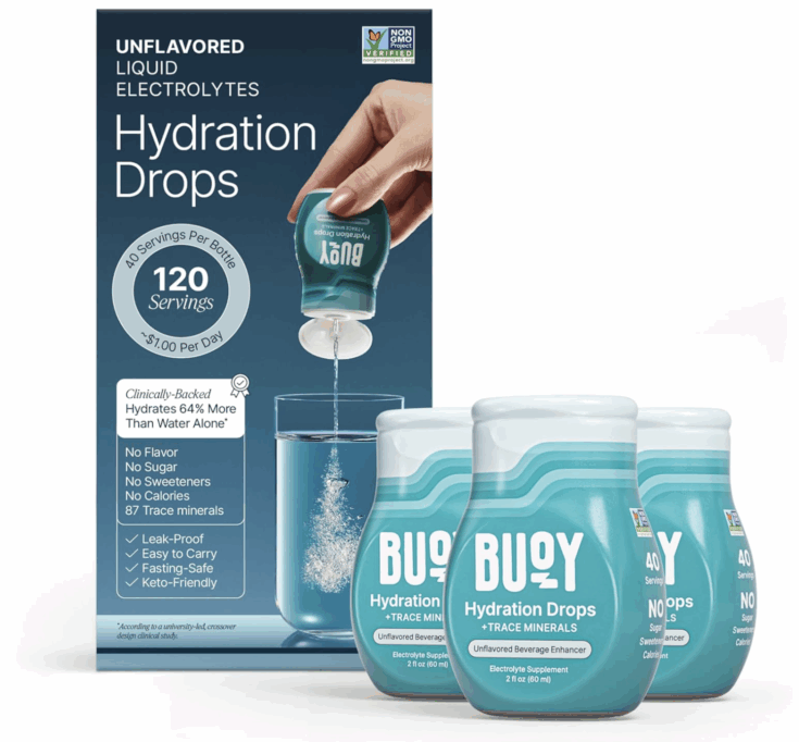 To stay well hydrated and feeling great this summer, add flavorless Buoy electrolyte drops to your beverages. Buoy electrolyte drops hydrate 64% more than water alone and 49% more than another leading electrolyte according to a University-led, crossover design clinical study.