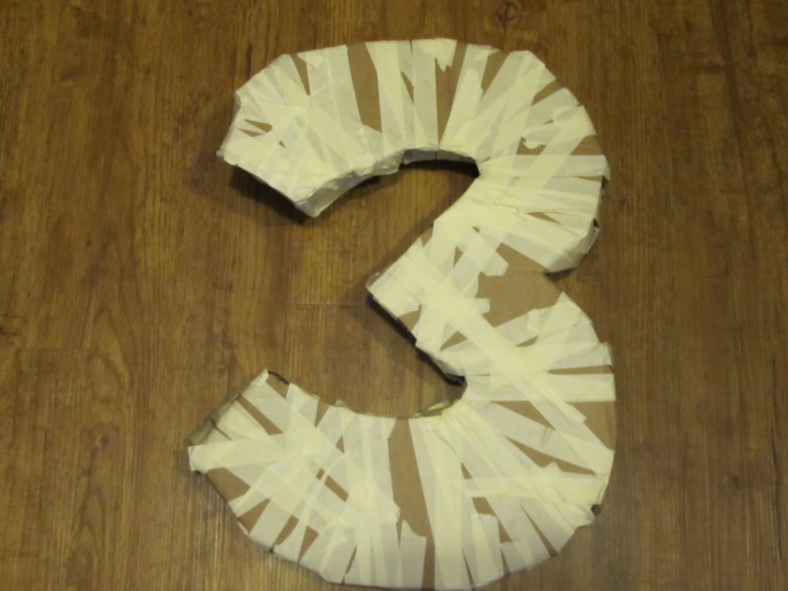 I then glued each piece to the "3," starting at the bottom. I cut the tissue paper to shape it on the curved sides. This step took a long time and I spread it out over a few days. I was getting pretty mad at the tissue paper by Day 3!
