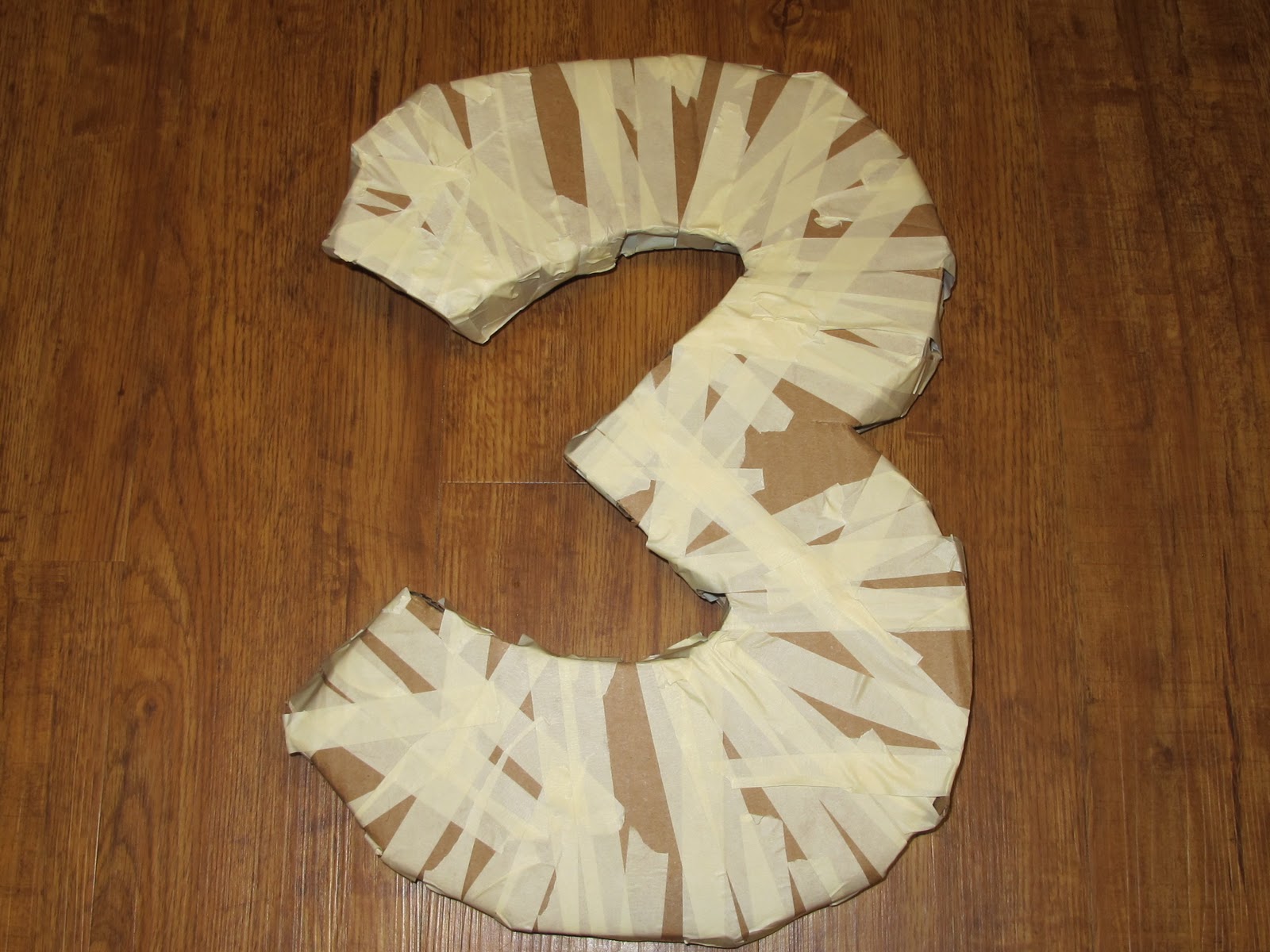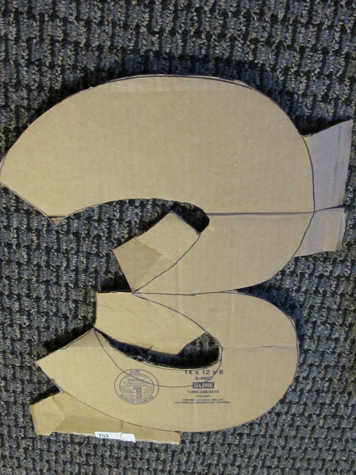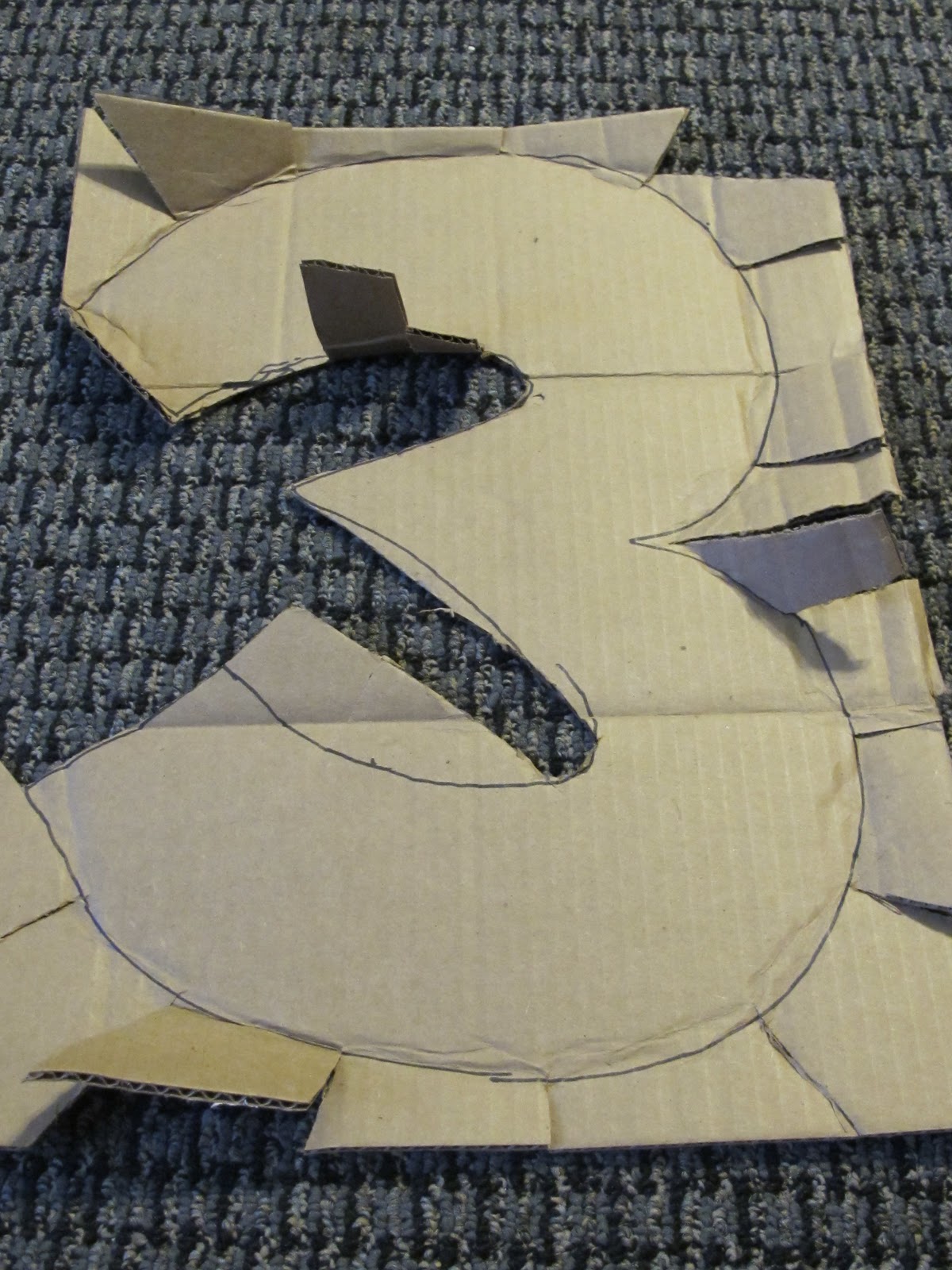 Next, I drew a "3" on two pieces of cardboard. Then, I cut the sides to make "tabs." Note: curves are hard. When I first saw this idea on Pinterest, it was a "1." That would be so much easier. But, I made it work....