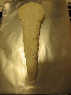 After he had shaped the cake, I applied a layer of thinned icing to prevent crumbs from getting in the final icing layer. To do this, all you do is use water to thin a bit of icing and put it on the cake so it sort of "soaks up" the crumbs. Let this dry for at least 30 minutes.